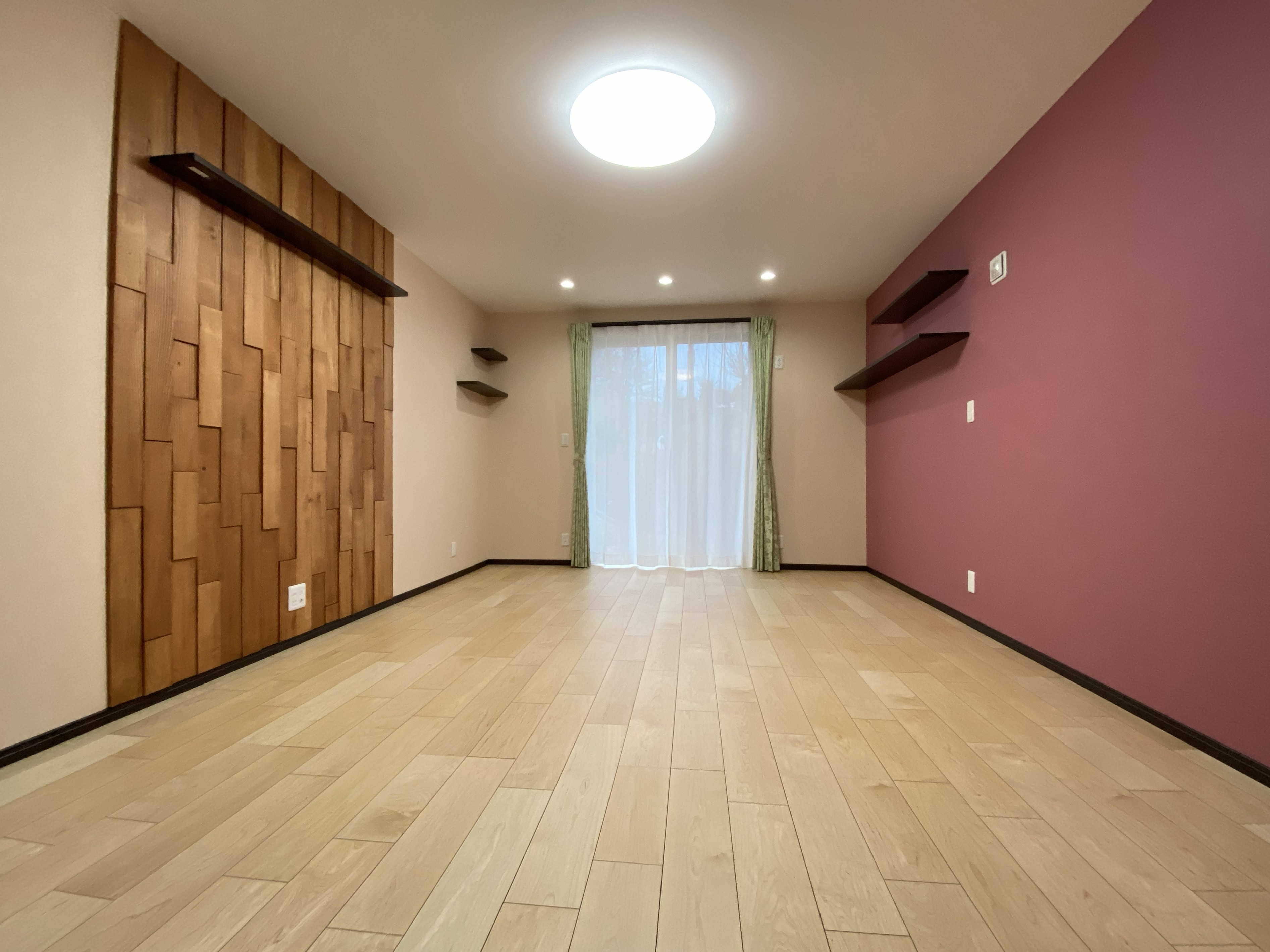 落ち着いた色合いと窓からの自然光が入るファミリールーム。