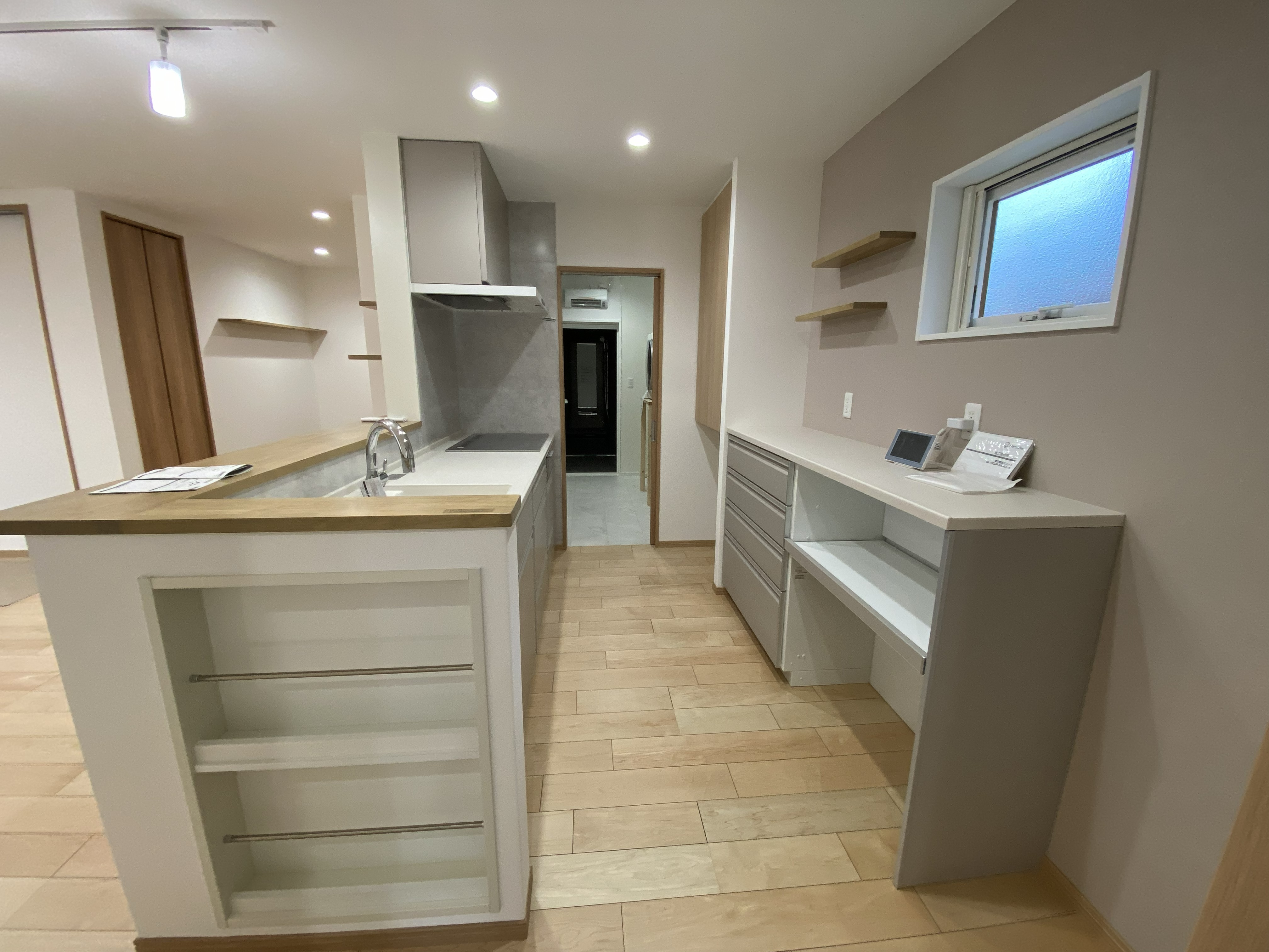 キッチン横にはマガジンラック。キッチンは自動水栓、IHクッキングヒーター、食洗器で家事も楽になります。